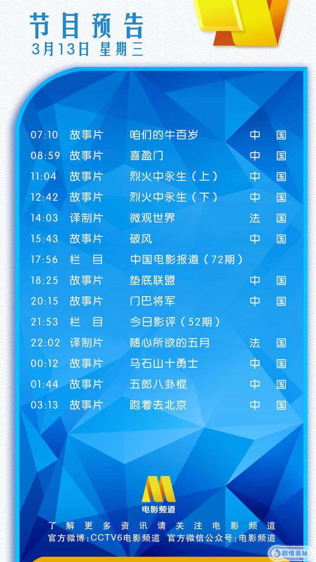3月13日电影频道播出节目单!11:04 赵丹 / 于蓝《烈火中永生》