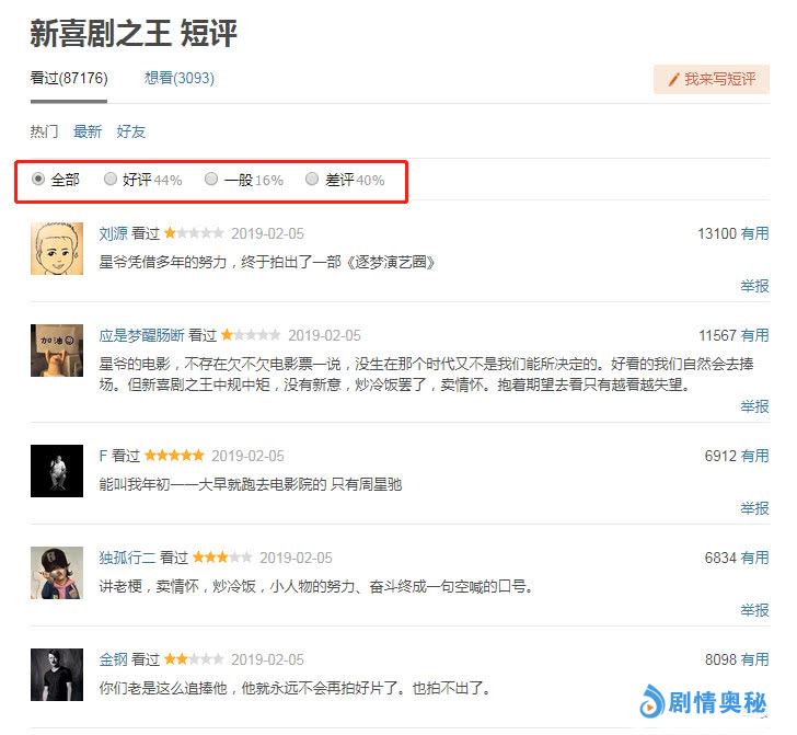 而从豆瓣网友观影后对该片的评价来看,影片《新喜剧之王》完全是一部失败之作。好评率仅有44%,差评率却一度高达40%,而一般也占据了16%。与此同时在豆瓣网友给予影片差评中,一条获得豆瓣13100个赞特别显眼,“星爷凭借多年的努力,终于拍出了一部《逐梦演艺圈》”。这一句完全概括了影片整个剧情,甚至富含了众多影迷对于该片的评价以及抵制心理。