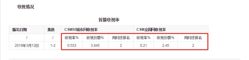 首部后,收视率上占据了CSM55城市网收视率0.553%的收视率,以及排在了同时段排名位居第二,与此同时,该剧在爱奇艺、腾讯视频、优酷视频等多个平台同步播出后,同样也获得了不菲的网播量,在CSM全国网收视率高达0.21%,位居同段排名第二。可惜的是,该剧热播后,在获得良好的收视率开局之际,该剧的口碑却呈现除了两极化,甚至遭遇了豆瓣网友给予清一色一星差评。