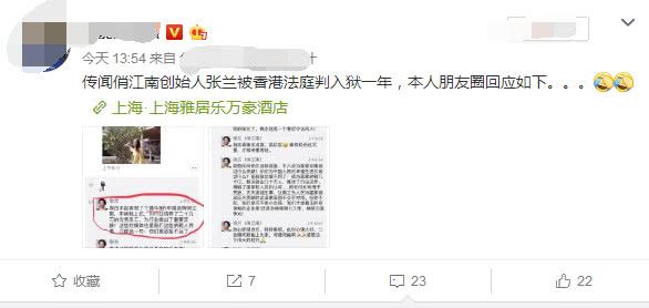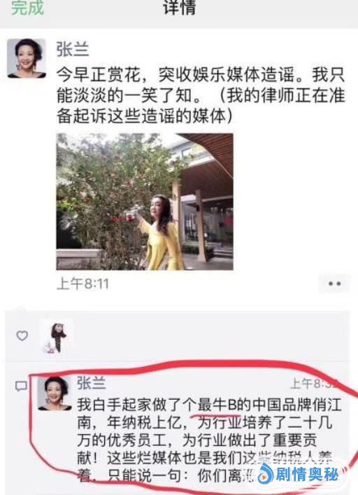 张兰女士发朋友圈表示,自己正在赏花,收到了媒体造谣,只能淡淡一笑了之,并表示委托律师准备起诉。随后她在朋友圈发布了长篇大论,矛头直指造谣的媒体。