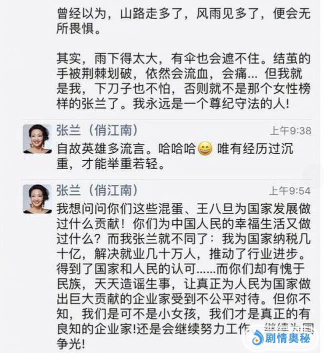 张兰还反问说:我想问问你们这些混蛋、王八蛋为国家发展做过什么贡献?我张兰就不同了,为国家纳税几十亿,解决就业几十万,推动行业进步。张兰罗列了自己的功劳,感到愤愤不平,还呛声媒体天天造谣生事。她放出狠话说:我可不是小女孩,我们才是真正有良知的企业家。