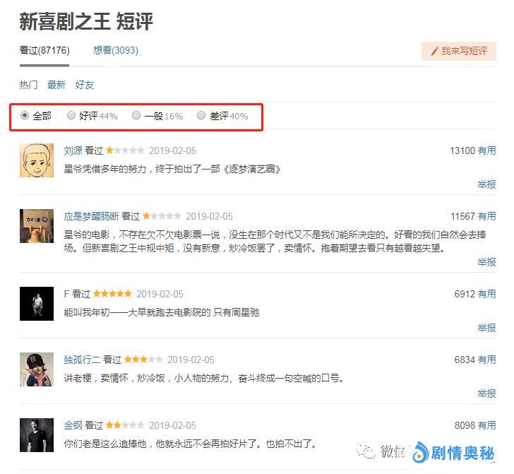 而从豆瓣网友观影后对该片的评价来看,影片《新喜剧之王》完全是一部失败之作。好评率仅有44%,差评率却一度高达40%,而一般也占据了16%。与此同时在豆瓣网友给予影片差评中,一条获得豆瓣13100个赞特别显眼,“星爷凭借多年的努力,终于拍出了一部《逐梦演艺圈》”。这一句完全概括了影片整个剧情,甚至富含了众多影迷对于该片的评价以及抵制心理。