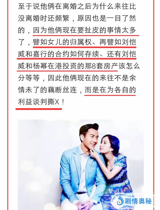 他们离婚后为什么来往比没离婚时还频繁?娱记解释说:原因也是一目了然的,因为他俩现在要扯皮的事情太多了,譬如女儿的归属权,再譬如刘恺威和嘉行的合约如何存续,还有刘恺威和杨幂在港投资的那8套房产该怎么分等等。因此他俩现在的来往不是余情未了的藕断丝连,而是在为各自的利益谈判撕X。