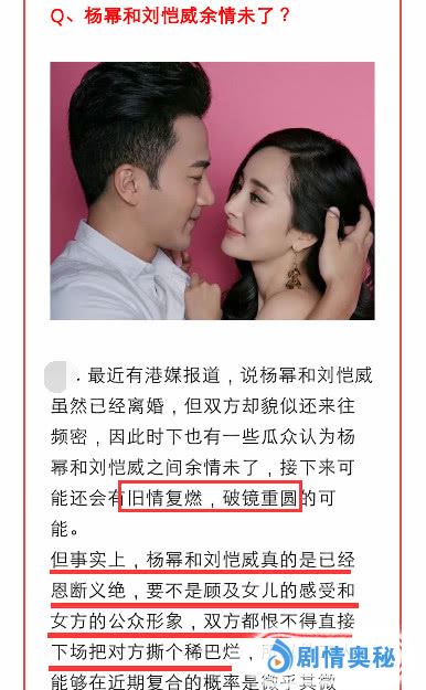 3月13号晚上,有一位资深娱记就网友提问的问题进行回答,对方提问:杨幂和刘恺威余情未了?娱记表示:最近有港媒报道,说杨幂和刘恺威虽然已经离婚,但双方却貌似还来往频密。因此时下也有一些公众认为杨幂和刘恺威之间余情未了,接下来可能还会有旧情复燃、破镜重圆的可能。但事实上,杨幂和刘恺威真的是已经恩断义绝。