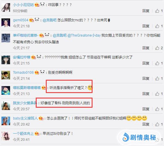 网友纷纷关心说:奔跑吧怎么照顾女MC的?我女儿上节目受伤的?能不能有点良心!姐姐怎么了,节目组在干嘛?这都多少次了!好像是挂了骨科!怎么去医院?拜托节目组能不能照顾好我们姐姐?早说过叫你别去。
