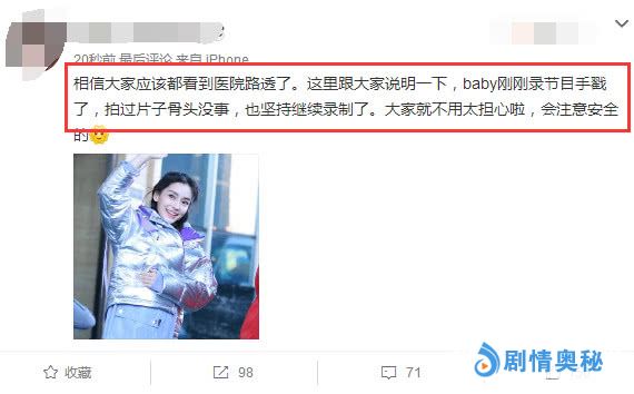 随后有知情者通报了Baby受伤情况:相信大家应该都看到医院路透了,这里跟大家说明一下,baby刚刚录节目手戳了,拍过片子骨头没事,也坚持继续录制了。大家就不用太担心,会注意安全的。