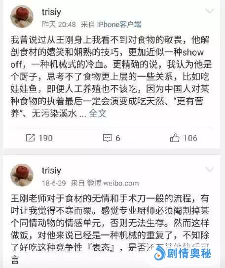 从王刚身上我看不到对食物的敬畏,他解剖食材的嬉笑和娴熟的技巧,更加近似一种show off,一种炫耀式的冷血。