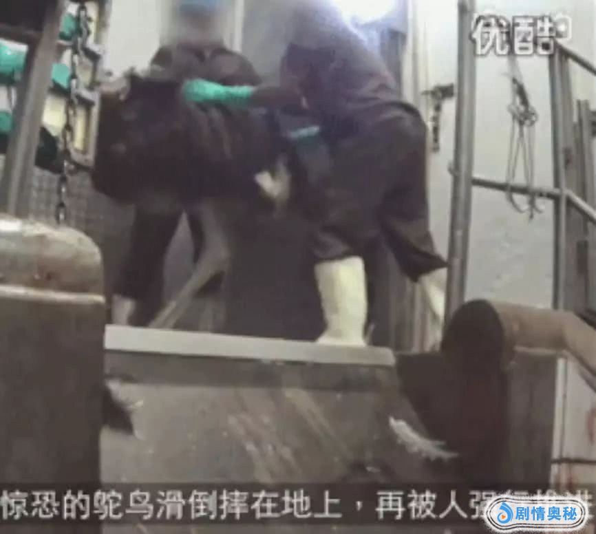 还没等鸵鸟完全昏过去,下一个步骤的工作人员早就迫不及待,拿着刀对着挣扎的鸵鸟的脖子,一刀两刀...