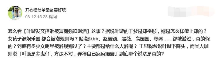 3月12号,有网友提出一个问题:怎么看叶璇发文控诉被富商强迫喝酒这事?据说叶璇的干爹是郑裕彤,她是怎么样傍上郑的?女孩子混娱乐圈都会被潜规则吗?该网友还扯上了范冰冰、赵丽颖、赵薇、高圆圆、杨幂……