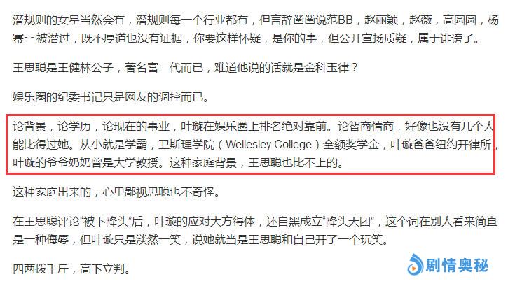 对方还大力赞赏叶璇:论背景,论学历,论现在的事业,叶璇在娱乐圈上排名绝对靠前。论智商情商,好像也没有几个人能比得过她。从小就是学霸,卫斯理学院(Wellesley College)全额奖学金,叶璇爸爸纽约开律所,叶璇的爷爷奶奶曾是大学教授。这种家庭背景,王思聪也比不上的。