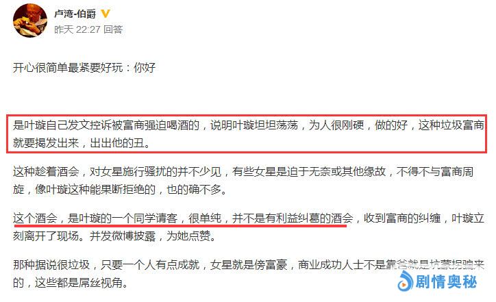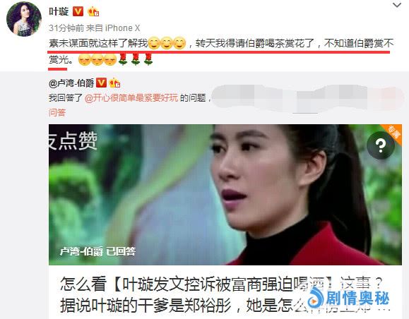 一位知情者在网上公开回答了这个敏感话题,叶璇看到后转发原文表示认可,还喊话说:素未谋面就这样了解我,改天我得请伯爵喝茶赏花了,不知道伯爵赏不赏光。