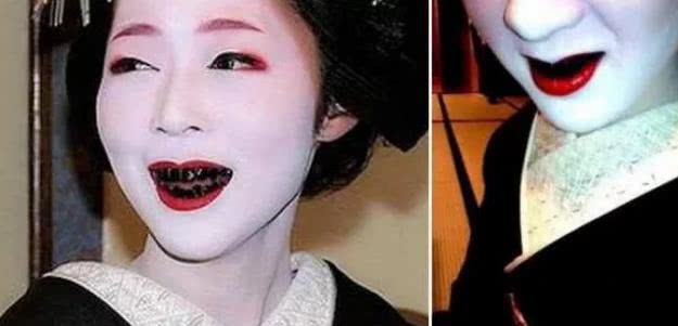 但是要说最让大家不能理解的,应该是日本的审美,当时因为受到了中国唐朝时期的审美,所以他们将自己的眉毛剃成了两个黑点,并且加嘴巴画成了樱桃小嘴,不过要说最奇葩的应该就是要把牙齿涂黑,这个是很多人所不能理解的,不过当时古代的日本女人以黑齿为美,现在在一些大型的祭祀活动上,也能看见这样的造型,惨白的脸再加上黑色的牙齿,白天都觉得十分的吓人,要是晚上突然出现,估计真的半条命都会没
