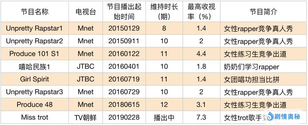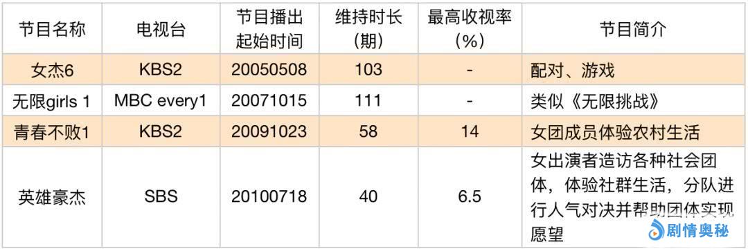 再加上《青春不败》(女团成员体验农村生活)、《英雄豪杰》(女出演者造访各种社会团体,体验社群生活,分队进行人气对决并帮助团体实现愿望),构成了早期女性主角综艺的版图。