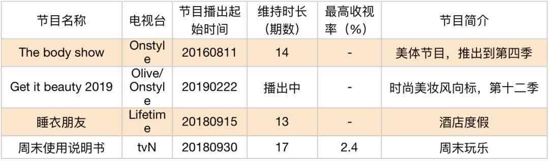 最后就是女性刚需类的节目,美容时尚/生活方式类,代表节目有《Get it Beauty》、《The body show》。《Get it Beauty》从2006年开播至今,向女性消费者传达美丽秘诀,成为美容/美妆界的风向标。在近年来又发展成为偏向于生活方式引领,比如《睡衣朋友》(主打酒店度假的概念)、《周末使用说明书》,融合了情感关系、人生态度、生活方式。此类节目直击女性观众的切身需求,自然长盛不衰。