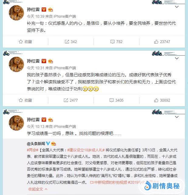 官代表说法刚刚提出不久孙红雷久连发了三条微博,对这个问题说了他的观点。他认为学习成绩不能代表一切,这很愚昧。找找问题的真正根源。又发了一条说:孩子不应该唯成绩论,也不是成绩好的孩子就优秀,唯成绩论太片面。最后一条微博:仪式感不是制造出来的,应该是人内心的信仰,要从小培养的。