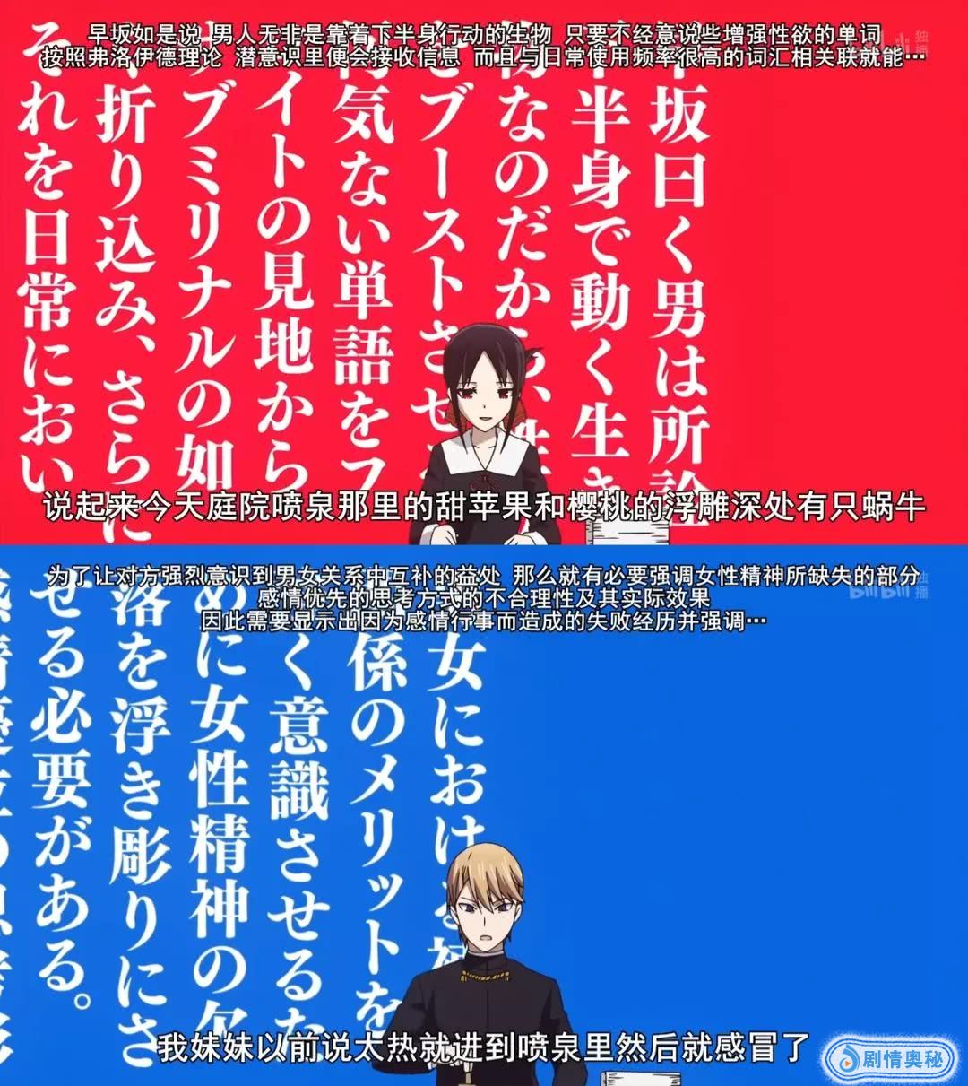 因为辉夜和会长(表面上)的人设都非常正经,本作表现的重点,便落在了主人公大量的心理活动上。