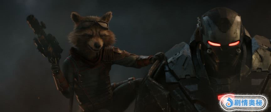 火箭浣熊在战争机器肩膀上,战争机器装甲得到升级了,视乎更加的庞大!火箭浣熊也得到了新的制服,还原了银河护卫队漫画中的经典制服。