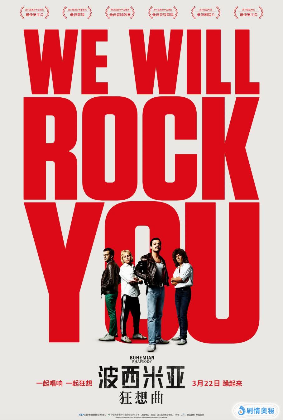 影片全新曝光的“震撼”版海报中,皇后乐队全员站在“WE WILL ROCK YOU”几个鲜红的单词前,十分吸睛。