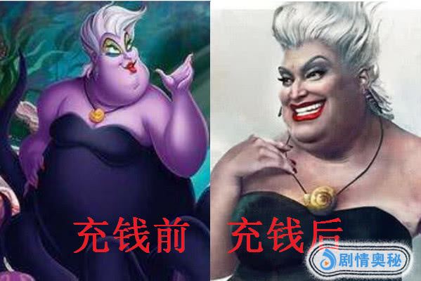 在第一张照片中,是我们非常熟悉的乌苏拉,他是一个非常经典的动漫人物,在充钱前,乌苏拉还是一个2D的人物形象,可是在充钱之后,乌苏拉直接成为了一个真人,不得不说,这个钱冲的还是非常值得,这个动漫人物也带给了我们不少的童年,给我们带来了很多的快乐。