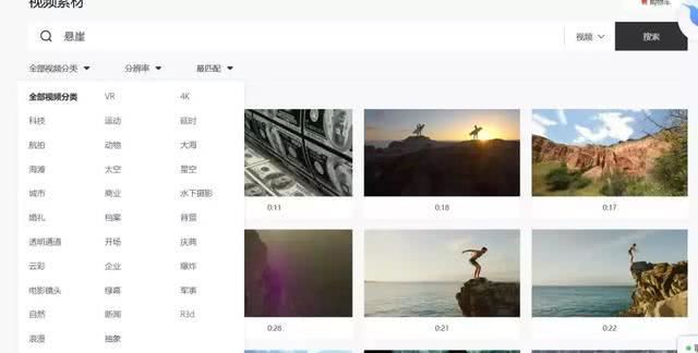 打开新片场素材库的页面,音乐素材可以情绪、速度、配器和风格等选项快速精确查找,视频素材则自行输入关键词筛选,拍sir随机输入“悬崖”得到300多页素材内容,根据视频画质、用途、风格等分类做进一步细分,找到合适的素材可以一键实时下载demo编辑试用。
