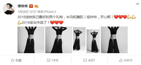 在生活中,谭维维很爱自己,还是个健身达人。她的微博除了公告之外,其余的都是运动的日常,跑步,健身房的日常打卡,都很励志。尤其那条关于送给自己最好的两个礼物,半马和腹肌。