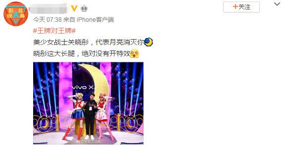 标示性的pose,再加上契合度百分之九十多的造型。以及那双没有开特效依旧逆天的大长腿,关晓彤是水冰月本月没错了。动漫中的美少女战士的特征之一不就是有双令人羡慕不已的大长腿嘛!对于彤妹子来说,1米08的优势可不是盖的(《王牌》节目有亲自量过腿长,有1米08)。美少女战士变身,不知道真人版的月野兔会不会喊出那句口号:“代表月亮消灭你。”作为水冰月的粉丝,相信关晓彤不会让自己的二次元爱豆失望的。而站在另一个美少女战士的身旁,彤妹子的气场也不输同样帅气的张天爱小姐姐。两人的美是各有千秋。一个甜美可人,另一个清新娇俏。
