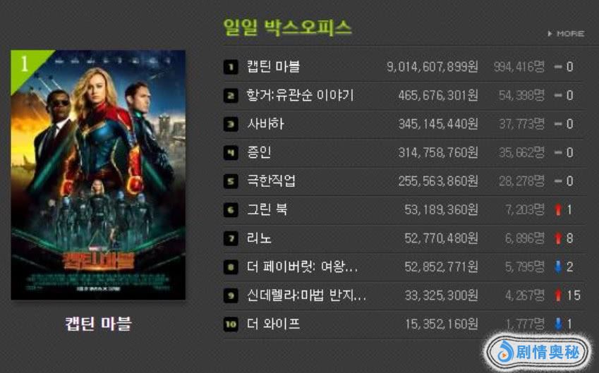 漫威新作《惊奇队长》在韩国连续9天蝉联单日票房冠军,本周末观影人数有望突破400万人次。