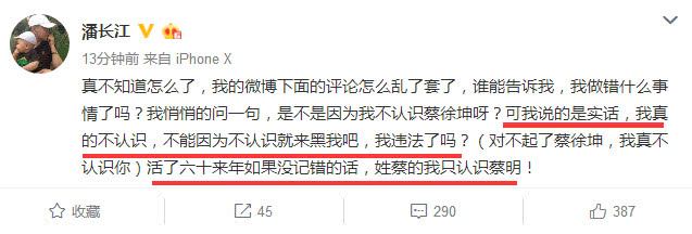 潘长江不堪蔡徐坤粉丝辱骂,不得不做出回应说:真不知道怎么了,我的微博下面的评论怎么乱套了,谁能告诉我,我做错什么事情了吗?我悄悄问一句,是不是因为我不认识蔡徐坤呀?可我说的是实话,我真的不认识,不能因为不认识就来黑我吧,我违法了吗?