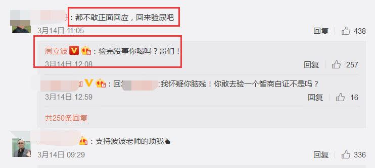 在3月14号时,有网友留言说:都不敢正面回应,回来验尿吧!周立波反击说:验完没事你喝吗?哥们!周立波这番话否认自己吸毒涉毒。