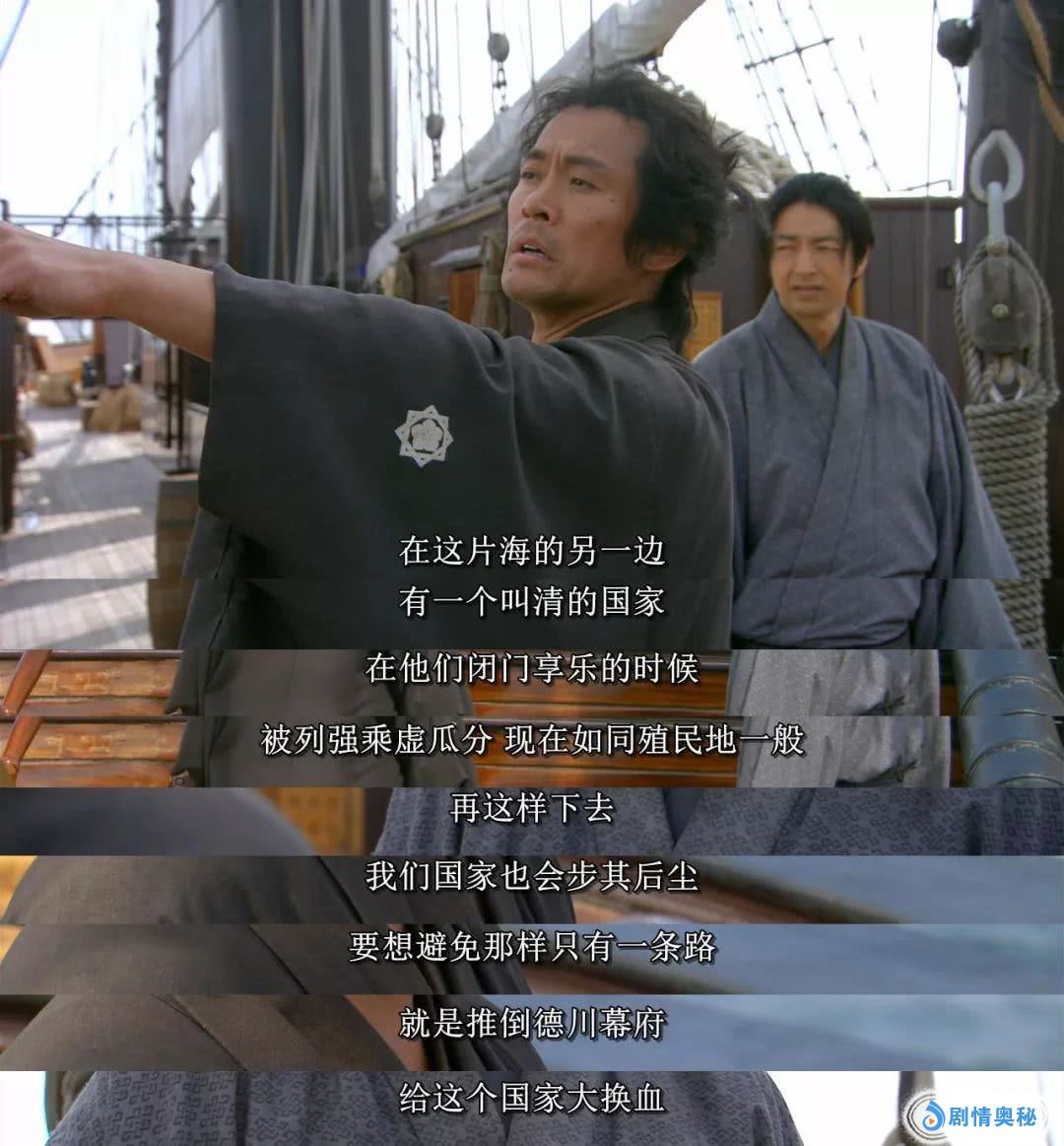 维新运动中的代表人物坂本龙马,面朝大海说:在这片海的另一边,有一个叫大清的国家。他们就是因为闭关锁国,才被列强乘虚瓜分。不想步他们后尘,只有一条路,就是推翻德川幕府,给这个国家大换血。