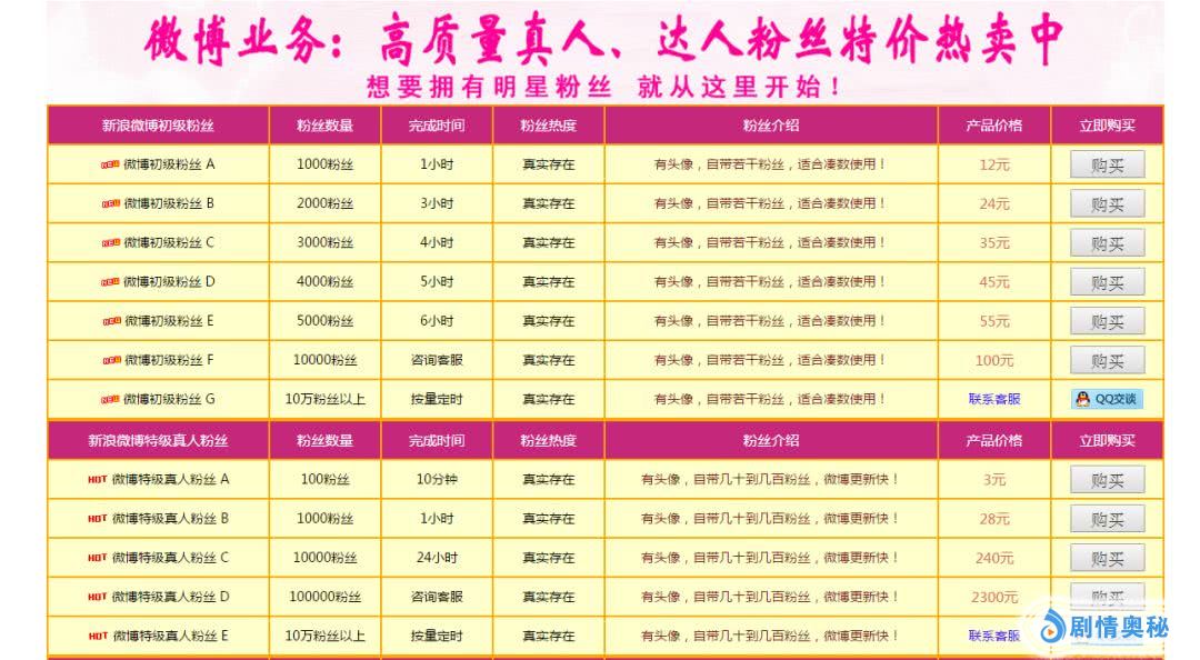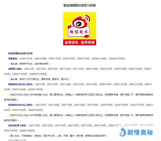 每种平台服务项目的报价单十分详尽。以微博刷粉为例,价格是依次递增的:初级粉丝100元/万个、特级真人粉丝240元/万个、精品粉丝(20%达人粉丝)500元/万个、极品粉丝(50%达人粉丝)900元/万个,以及指定地区真人粉丝900元/万个。