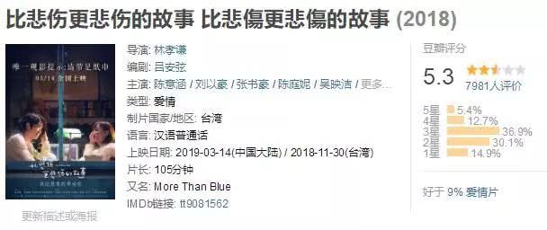 自封为年度最催泪的爱情片《比悲伤更悲伤的故事》口碑并不好,在豆瓣才拿下了5.3分,好于9%的爱情片,两星及以下差评占比高达45%。