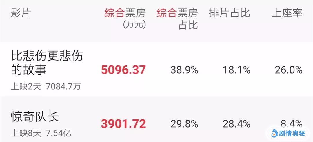 《比悲伤更悲伤的故事》当日的排片占比为18%,而《惊奇队长》的排片占比则为28%,在这样的情况下,还能反超,胜在上座率表现出色。