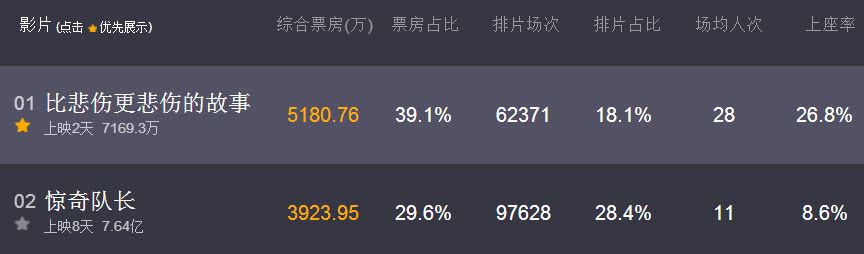 从3月15日的数据来看,《比悲伤更悲伤的故事》当天的排片仅仅才18%左右,比起《惊奇队长》的28还要少出很多,但是却拿下了5180万的单日票房,远胜过了《惊奇队长》3923万的票房成绩,可以说是轻松的力压《惊奇队长》夺得当天票房冠军。