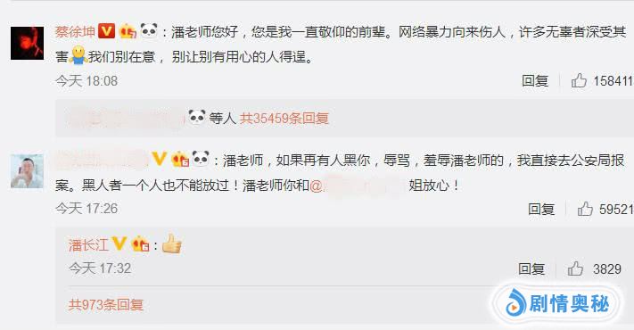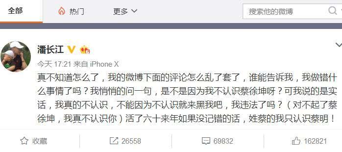 无奈之下,3月15日潘长江在微博中公开回应了此事,在微博中潘长江大致这样写道:“真不知道怎么了,我微博下面的评论乱了套,悄悄问一句,是不是因为我不认识蔡徐坤的缘故?可我说的是实话,我真的不认识蔡徐坤,我违法了吗?”显然潘长江老师已经深陷网络暴力当中,而原因竟然是因为他在综艺节目中没有第一时间认出蔡徐坤。