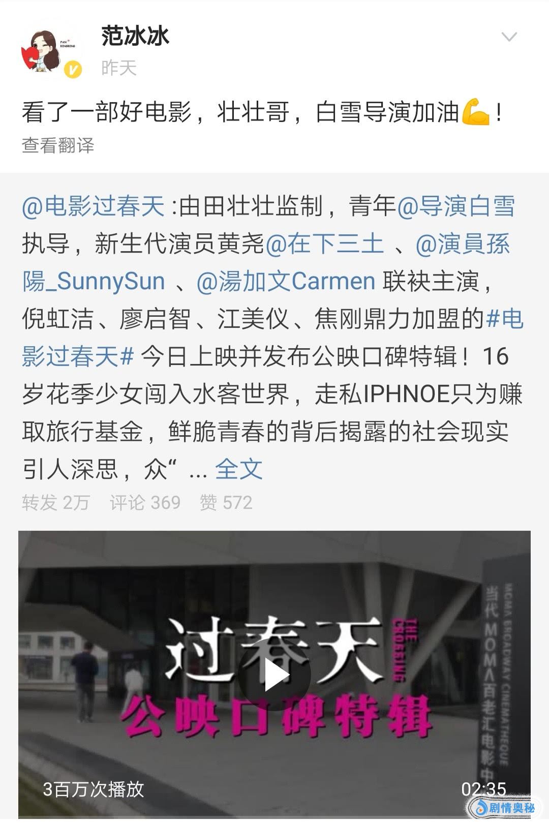 《过春天》在全国热映,一些明星在看过电影后也进行了推荐。范冰冰15日晚也发布了一条微博,称《过春天》是一部好电影,看过以后非常不错。
