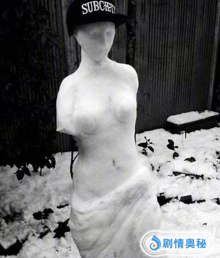 这个雪人就非常有创意了可以看的出来是美丽的断臂维纳斯,就连维纳斯围着的纱巾都刻画的惟妙惟肖,但是头上戴着的棒球帽是个什么画风?让整个维纳斯的感觉完全变了,也是佩服老外的想象力。