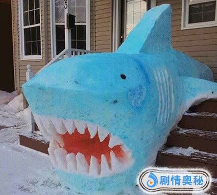 外国人好像特别执着给选人上色,这个问题可以看出这个地方下的雪还是比较深的。而这家人也是够牛,竟然在自己的门外推出了一只大鲨鱼,鲨鱼的牙齿清晰可见,嘴里的血盆大口也是十分吓人,只不过这个画风竟然让鲨鱼有一丝可爱呢。
