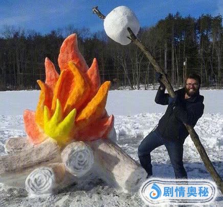 比如说这位来自外国的朋友他堆的雪人简直了不能就是雪人应该叫冰雕才对而且可以看的出来他给这个造型上的颜色三层和验上了三种不同的颜色连底下的木头都有颜色还是他拿起了一颗大树枝还在树枝上面用血做出棉花糖的造型,不知道这样的棉花糖用火烤完以后,他要吃多久呢?