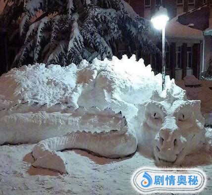 最后这款应该是来自我们国家的朋友堆的吧,一看就是一个中国龙的造型,和旁边的路灯一对比这个雪人堆的事特别庞大啊,看来应该下了不少功夫,用的雪量也非常大,这绝对不是一个人就能完成的,应该是很多人一起做出来的,而且还瞄了黑色的边,真是佩服这样的工程量。