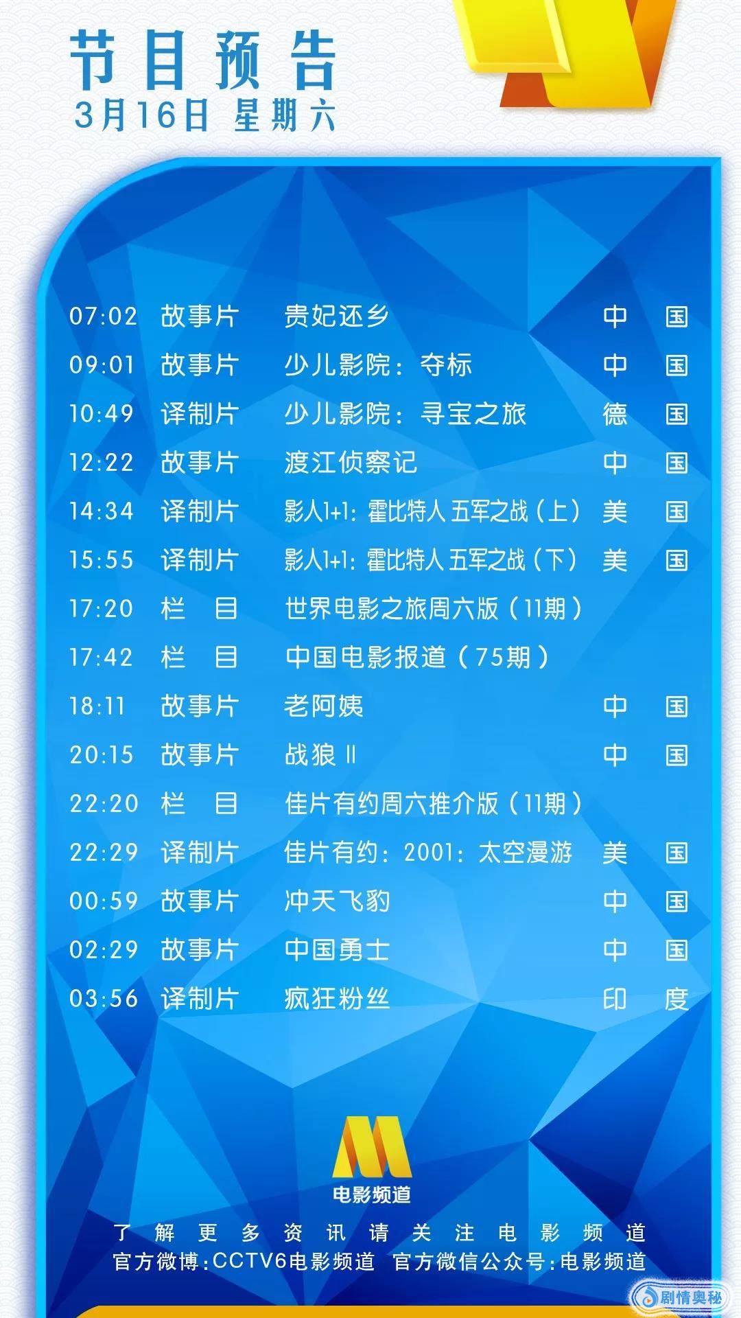 3月16日电影频道播出节目单!《战狼2》《2001:太空漫游》