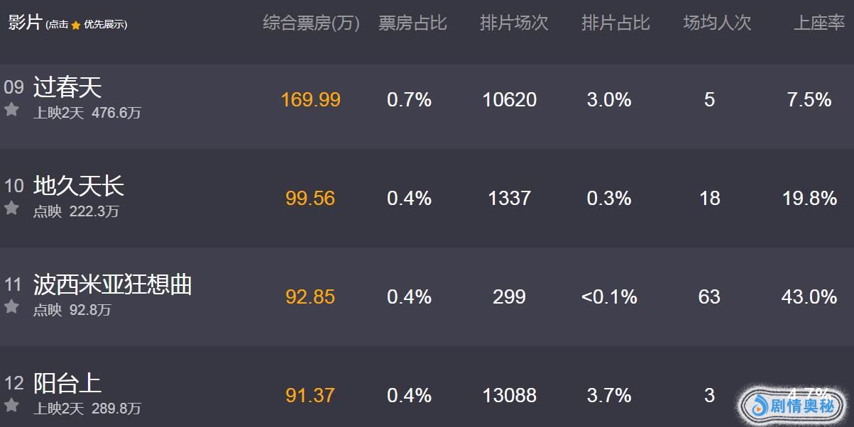 《阳台上》首日票房哑火后,第二天的放映场次就被院线砍了一半多,今天只排映1.3万场次,这是被影院彻底放弃了。目前实时仅收91万(截止20点),较昨日191万暴跌了一半以上,上映2天累计289万元。该片的上座率片方看了要哭晕,场均3人次观众终于享受到了包场的待遇。今天全天累计也就300万上下,周六都哑火了后面的票房还有指望了吗?