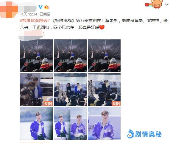 3月16号中午,有网友发布了《极限挑战》第五季最新路透照,录制地点在上海。爆料者发文说:老成员黄磊、罗志祥、张艺兴、王迅回归,四个兄弟在一起真是好暖。