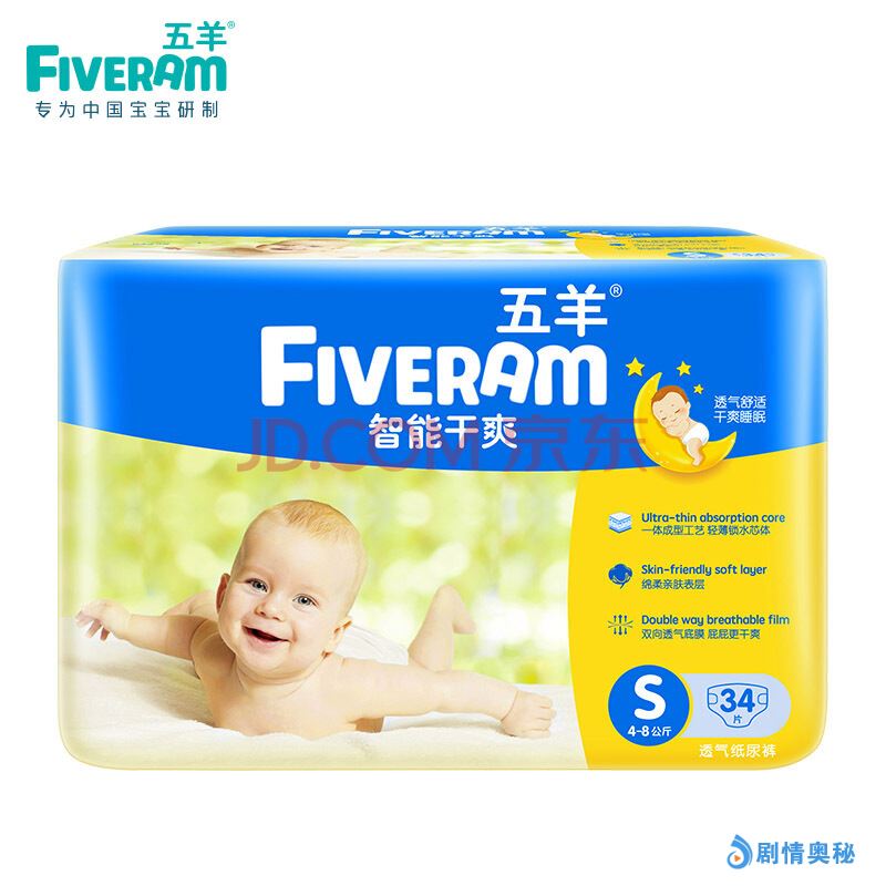 五羊(FIVERAM)智能干爽纸尿裤34片S码(4-8kg)