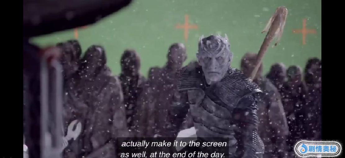 和国内不同,国外对特效制作极其重视,他们为特效制作投入了大量的资金,因此国外的特效看起来也总是更加真实也更加震撼。不过在《权游》中也有一写常见的特效制作手段。就好比鬼骷髅里面的骨骼中的空洞感,其实就是在需要露出洞的范围穿上绿色的抠图专用布就可以了,还有最常见也是最经济的特效,鼓风机特效。只靠一台超大功率的鼓风机,就可以制作出各种漫天飞舞的效果。
