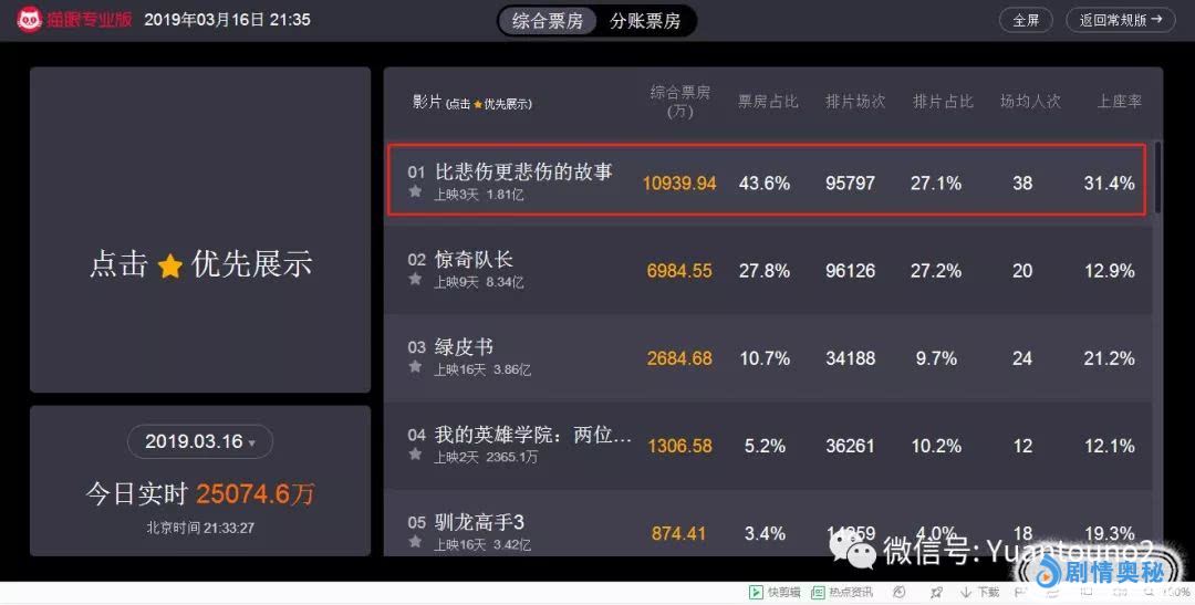 甚至影片在上映后票房更是持续渐长,截止发文时间,影片上映3天,累计总票房已经突破1.8亿,上座率高达31.4%,排片场次多达95797场次,占日排片率27.1%,与《惊奇队长》不相上下。在日票房占比率上同样高达43.6%,除了超越《惊奇队长》,还一度碾压了《过春天》和《阳台上》两部同题材影片。