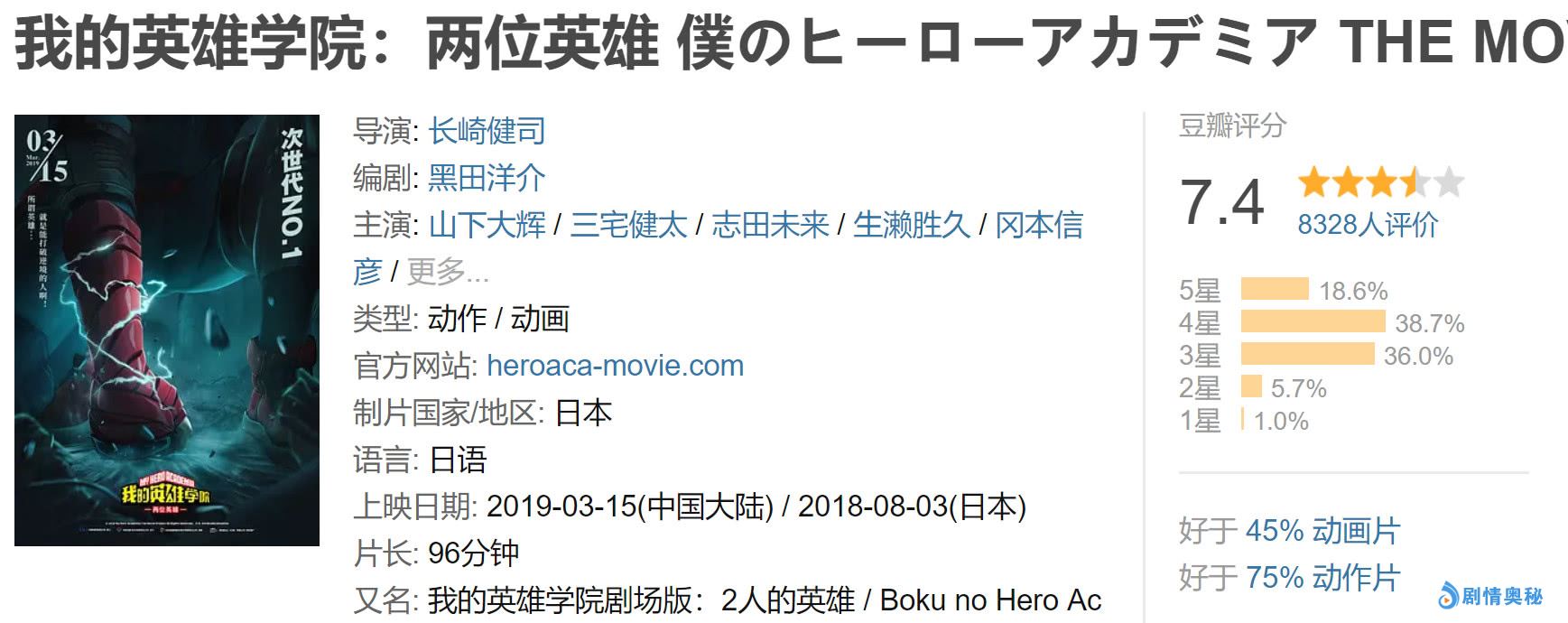 值得一提的是,这部《我的英雄学院:两位英雄》在北美的评分机构,IMDB上拿下了8.0分,而国内评分机构豆瓣电影上也是给出了7.4分的高分,可见这部电影本身的质量还是相当高的了。