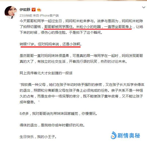 伊能静表示,儿子哈利虽然17岁了,但是对于妈妈来说,他依旧还是一个小孩。同时还指出儿子已经长大了,有自己独立社交生活,开着流行语玩笑,热烈讨论未来。