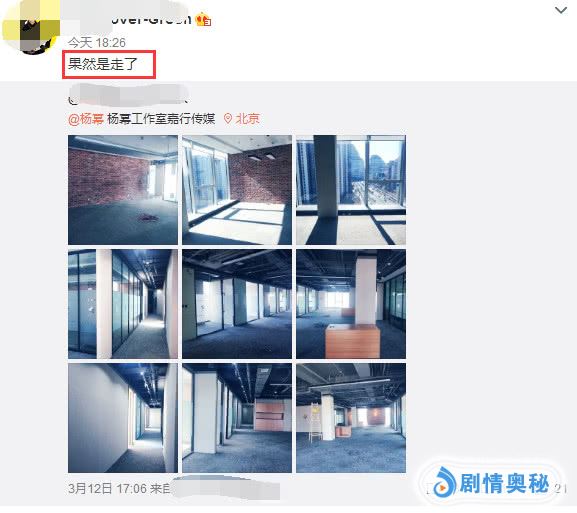 3月16号下午6点多,有大号转发了杨幂工作室办公地点照片,现场照片显示杨幂工作室已经人去楼空,室内都是空荡荡的,没有一个员工在办公,这是什么情况?