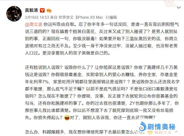 周立波也开始在微博回击,双方的对战已经从本人升级到了子女,黄毅清更是爆周立波涉毒、为同性XX,黄毅清称周立波为“涛涛”,周立波喊黄毅清“海娘娘”。